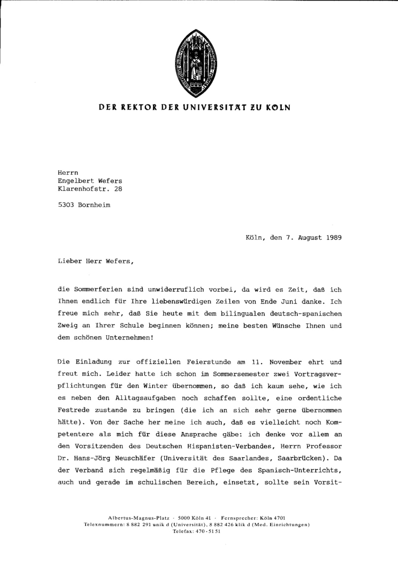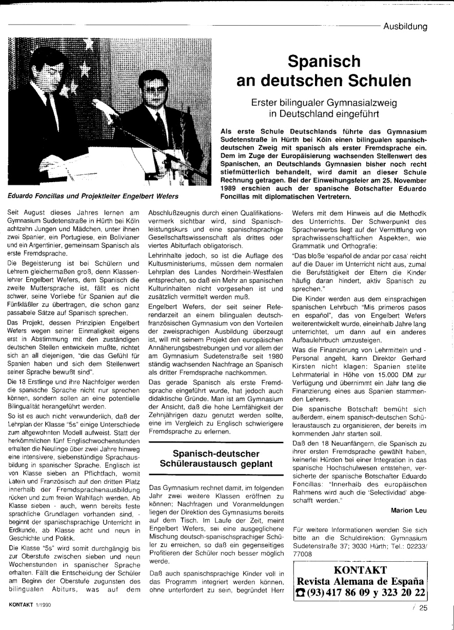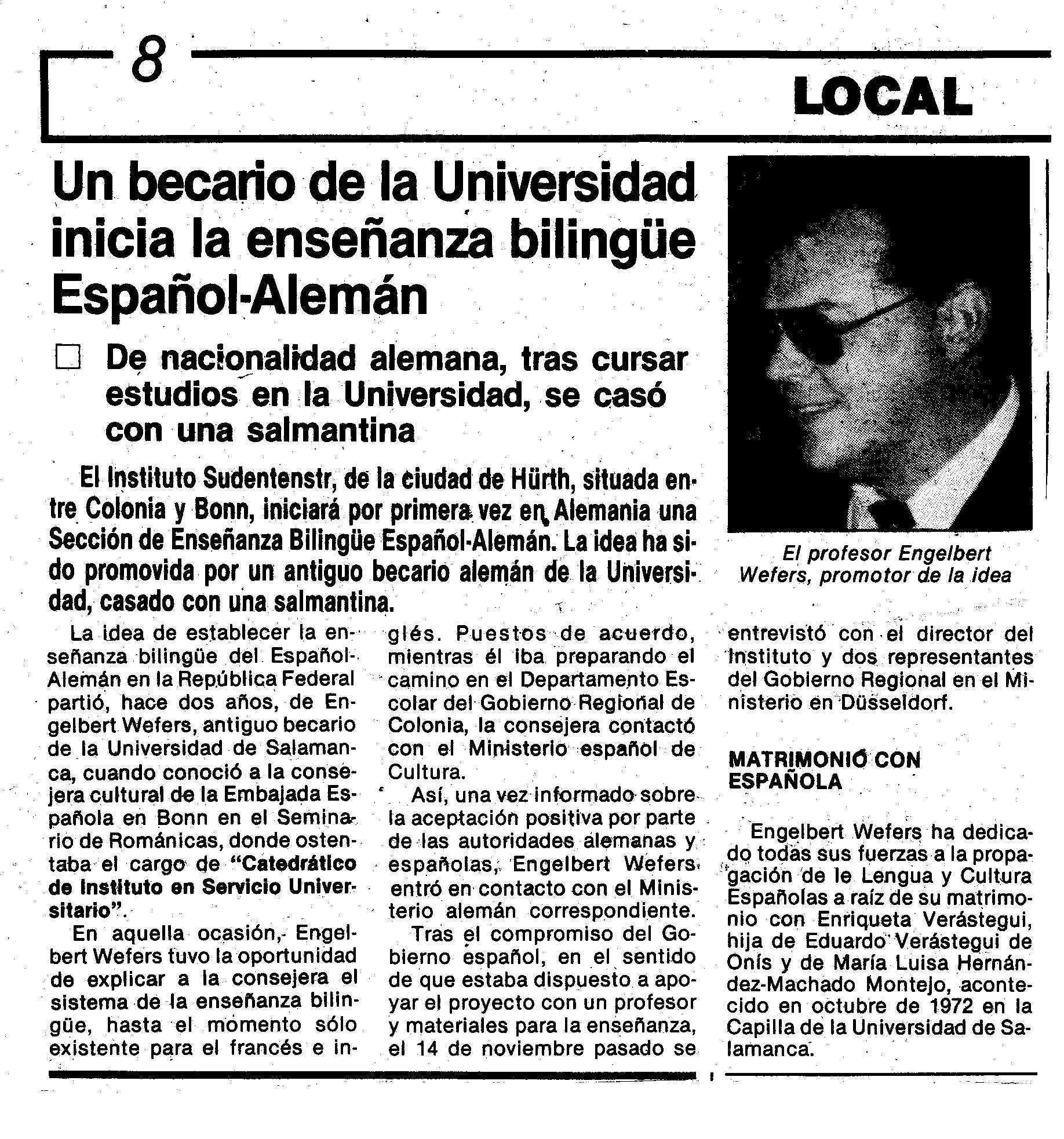 Este artículo se publicó en el periódico salamantino "La Gaceta" el uno de diciembre de 1988. Una semana antes estaba en el entonces Ministerio de Cultura en una reunión donde estaban presentes OStD Kirsten, Director del Instituto de Enseñanza Media "Gymnasium Sudetenstr." (hoy Albert-Schweitzer-Gymnasium), los directores generales del Ministerio de Cultura: Dr. Detlev Acker y ?? y los directores gerentes de educación del Gobierno Regional de Colonia, los Dres. Christ y Bellartz.